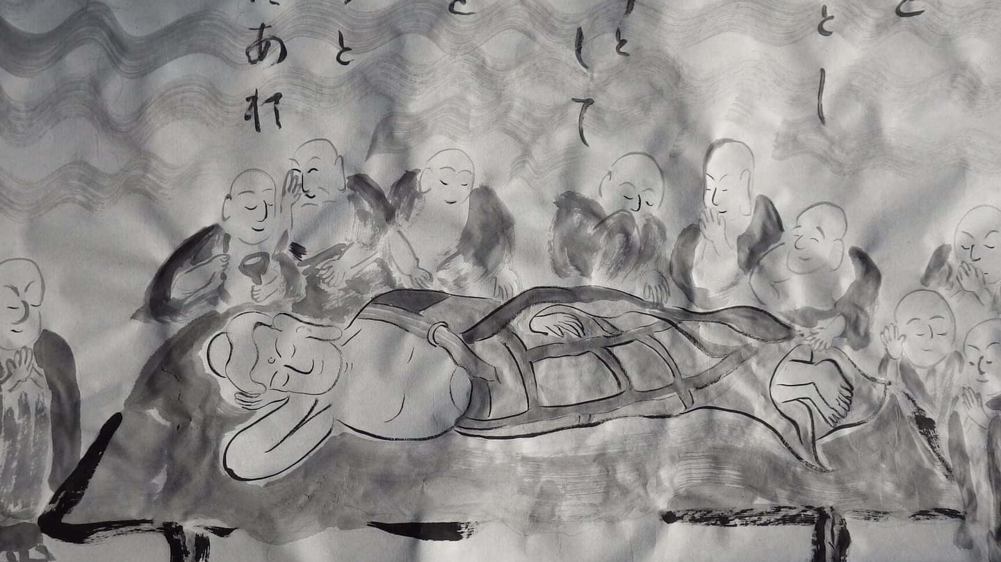 大慈院 | 禅の教え TEACHING SERMON 親しみやすい禅 花まつり 花まつり 般若心経 般若心経 十牛図 十牛図 大燈国師遺誡 大燈国師遺誡 脱力・陰陽 脱力・陰陽 禅画 涅槃図 お釈迦さまが亡くなられるときの様子を描いた絵を涅槃図(ねはんず)と呼びます。大徳寺でも毎年2月15日には佛殿に大きな涅槃図を掛げて、涅槃会のお参りをしています。墨で描いてみましたが、亡くなられたというようりは昼寝をされているような感じになってしまいました。でもこんなふうに春に花の下で、アウトドアで死を向かえるのもいいかもしれません。